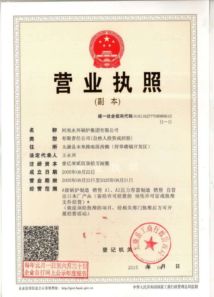 河南永興鍋爐集團有限公司是一家專業從事各類鍋爐及各種熱能機械設備研究開發、制造銷售、安裝服務的集團公司。公司持有A級鍋爐制造資質、A1、A2類壓力容器制造資質及機電設備安裝工程專業承包資質,并通過了國際ISO9001 2000質量管理體系認證。公司是嚴格遵循ISO9001國際質量管理體系保證模式,開展質量管理和質量檢測控制活動,產品質量穩定。被河南省工商局評為“重合同守信用企業”、被農業部評為“全國誠信守法企業”、被中國質量技術監督協會納入會員單位,并有獲有多項專利技術。